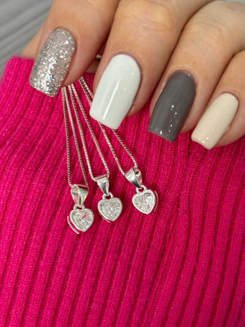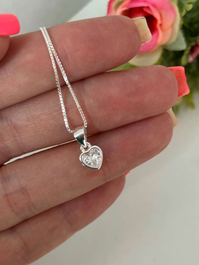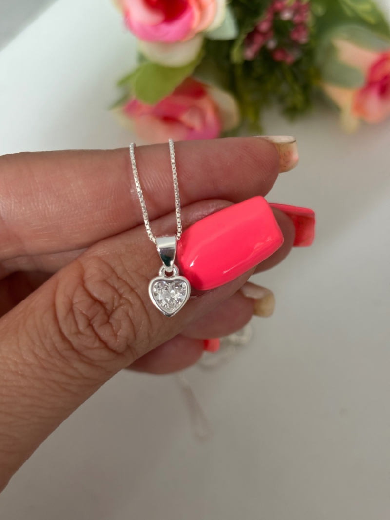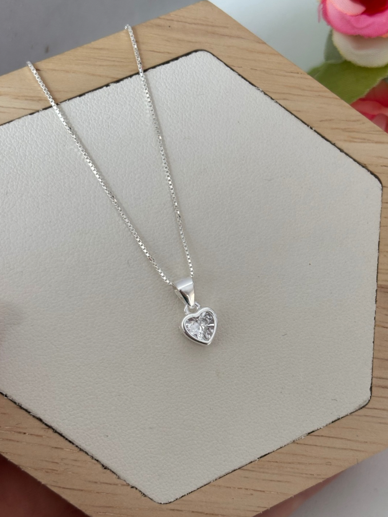 Cadena veneciana fina con dije punto de luz en forma de corazón, circonia color cristal. Tamaño del dije: 6mm. Plata 925. (Si necesita otro largo de cadena aclarar en el sector “notas”).